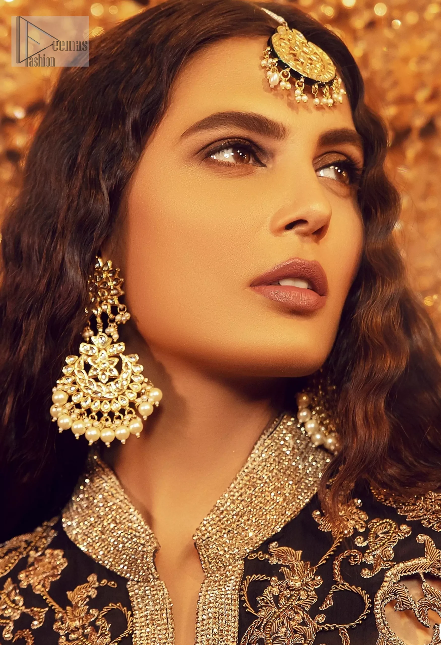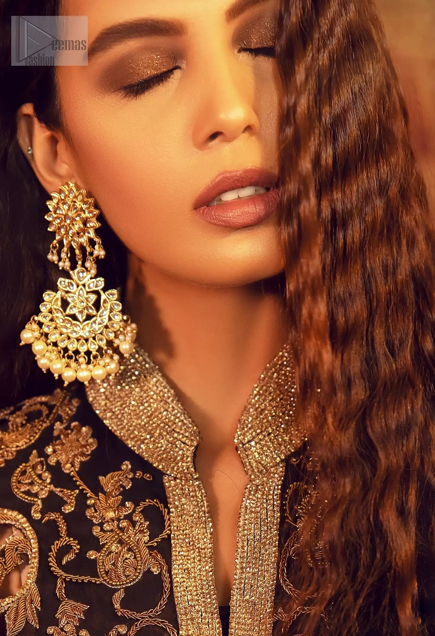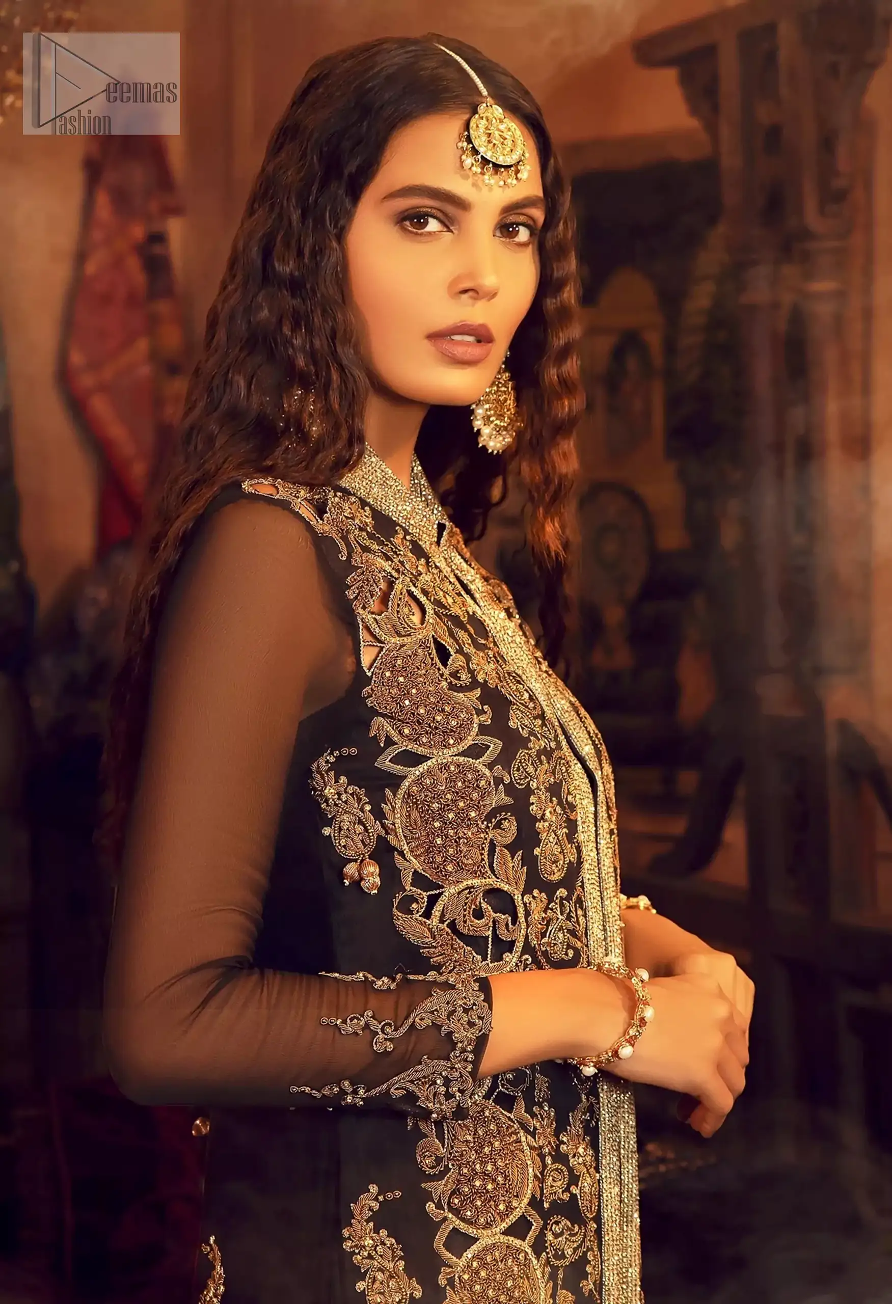 Make a bold statement with the Black Front Open Long Jacket Inner Shirt Trousers, where sophistication meets contemporary flair. The jacket’s collar, neck and open front design add a modern touch, while the antique embroidery and golden threadwork enhance the luxurious feel. This ensemble exudes confidence and elegance, paired with an inner shirt and trousers. Crafted from pure tissue silk and organza, this creation is perfect for a Pakistani party, blending modern style with classic luxury. You radiate power, grace, and an undeniable sense of poise with every step.