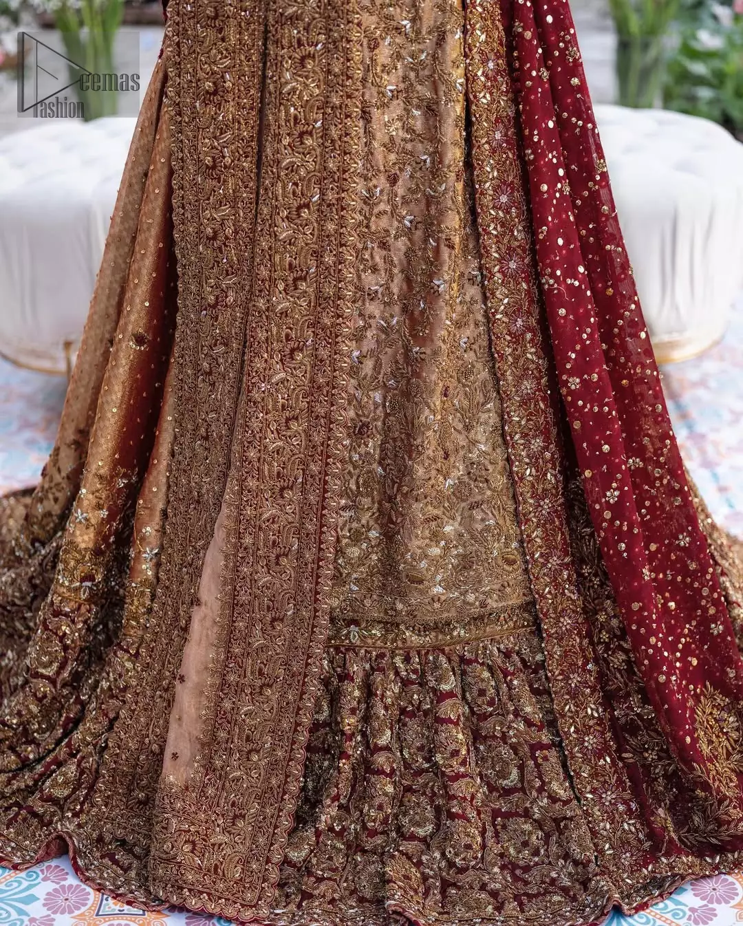 The copper long shirt is paired with a farshi-style lehenga and a maroon organza dupatta to create a traditional look. The shirt is made from pure tissue, which gives it a soft metallic finish that works well with antique embroidery spread across the front and sleeves. Its round neckline and full sleeves let the colour and craftsmanship stand out, with the design being simple and wearable. The farshi lehenga adds weight and structure without feeling overwhelming, and the maroon dupatta brings contrast that ties the whole outfit together. It’s a remarkable choice for Nikah function.