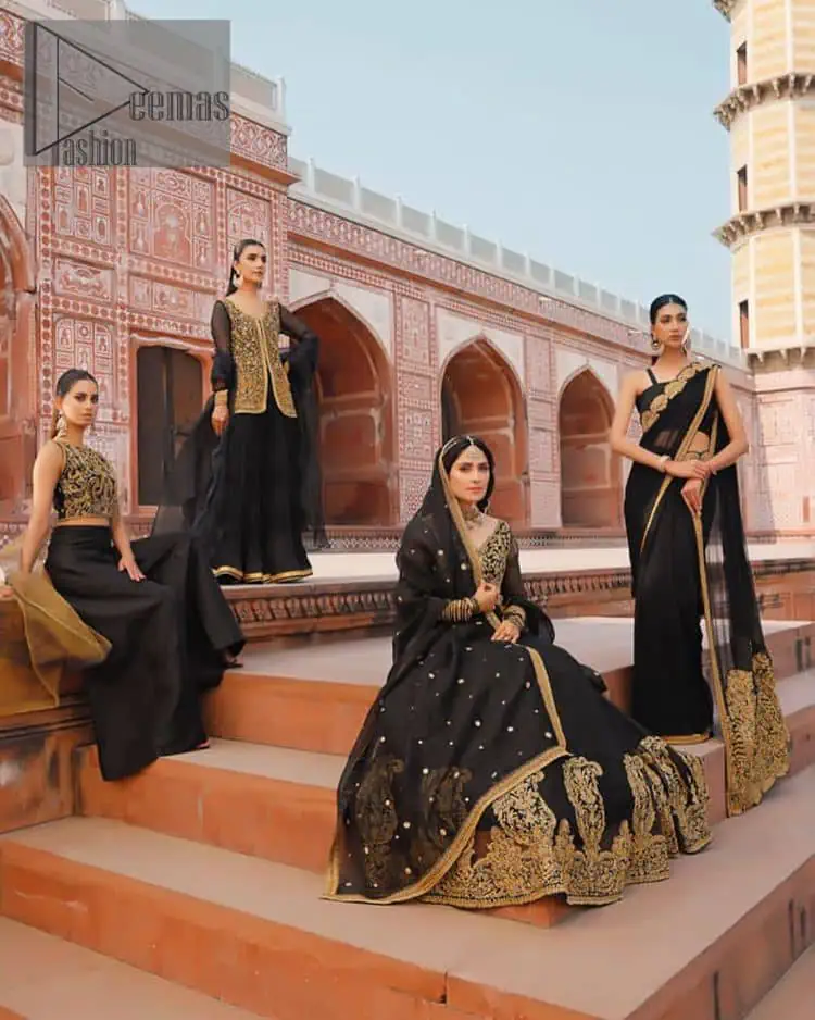 With the timeless charm of black, so back on traditional flavour to steal everyone’s heart. Introducing the black jacket that is the epitome of splendour with delicate details beautifully decorated with golden colour. The bodice of the coat is enhanced with stunning embroidery with worked finishing of tilla, kora, dabka and zardozi. The addition of simple sleeves with a V-shaped neckline can be done to make this super traditional. To complete this conventional jacket, a crushed sharara is added to give you an amazing look at any formal event. Complete this black outfit with a black dupatta in a plain style that is perfect for any intimate evening.